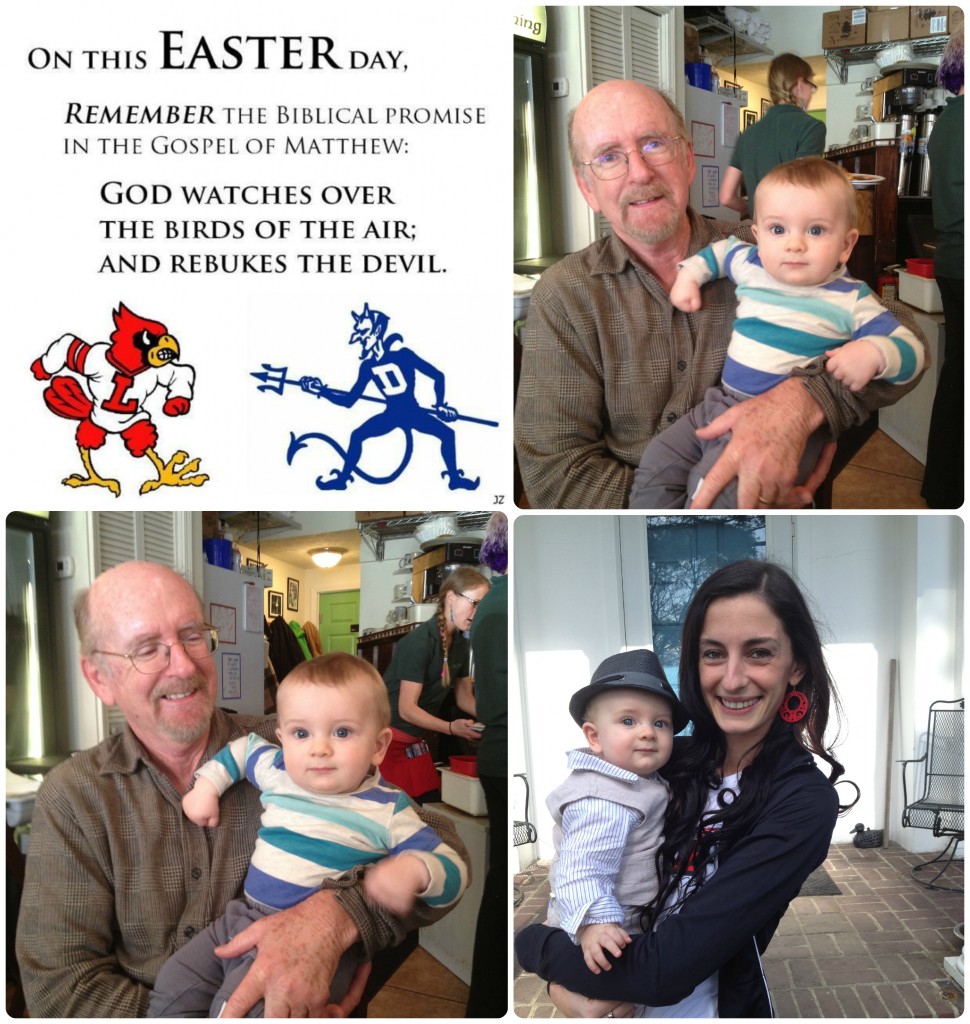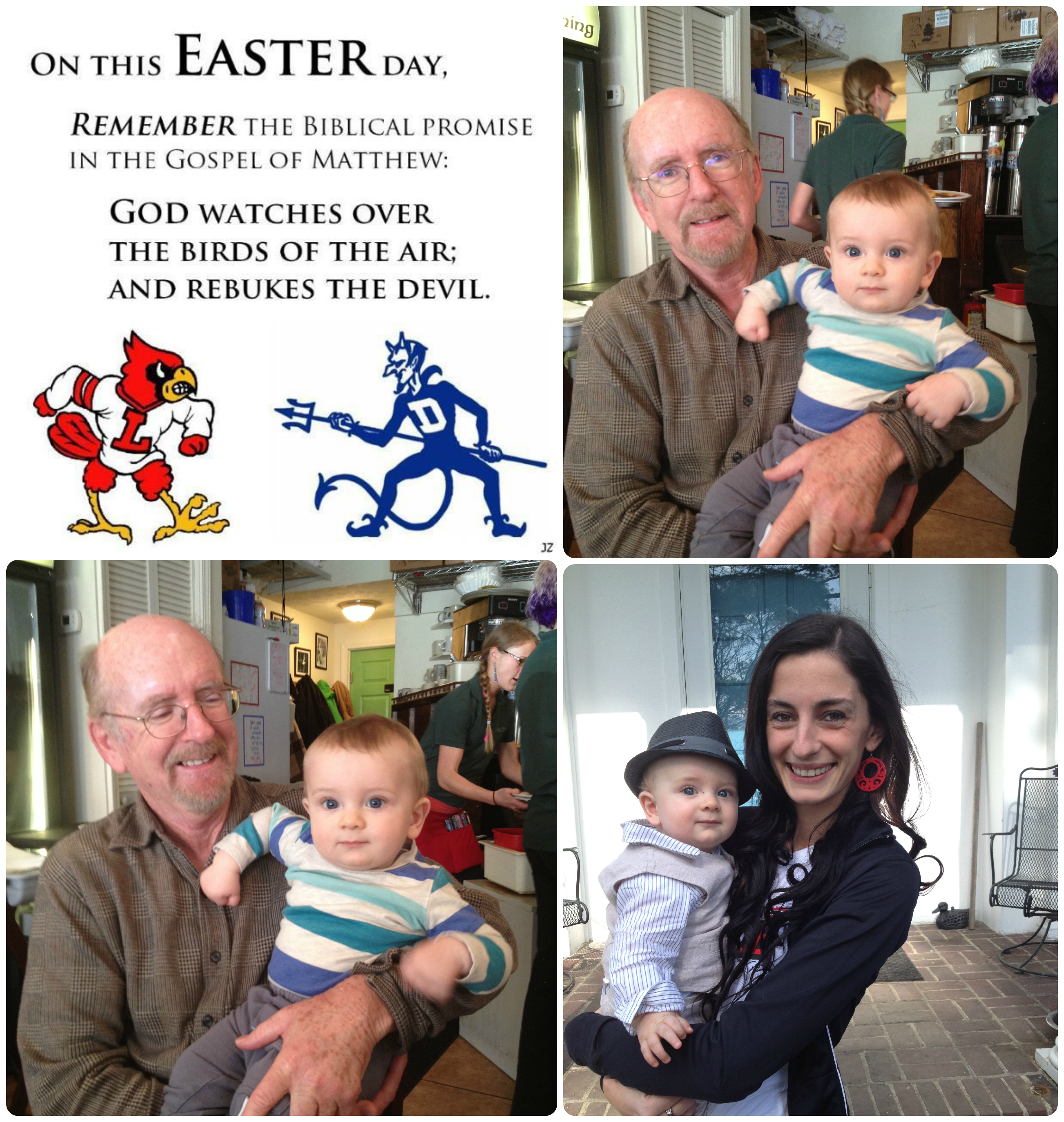 Lucas! Guess what?!? The Easter bunny came to visit you. And you were such a lucky boy, you got TWO baskets, one at Grammy and Poppy’s house, and one from our house. You got lots of new books, and a cool toy, a stuffed animal and even a finger toothbrush to practice brushing your 4 teeth! We visited Louisville for Easter and had Easter dinner with Poppy, Aunt Katie, and Uncle Michael (Uncle Joey and Grammy were not in town), then we cheered on our Louisville Cards as they beat Duke to advance to the Final Four. Overall it was a successful holiday!
