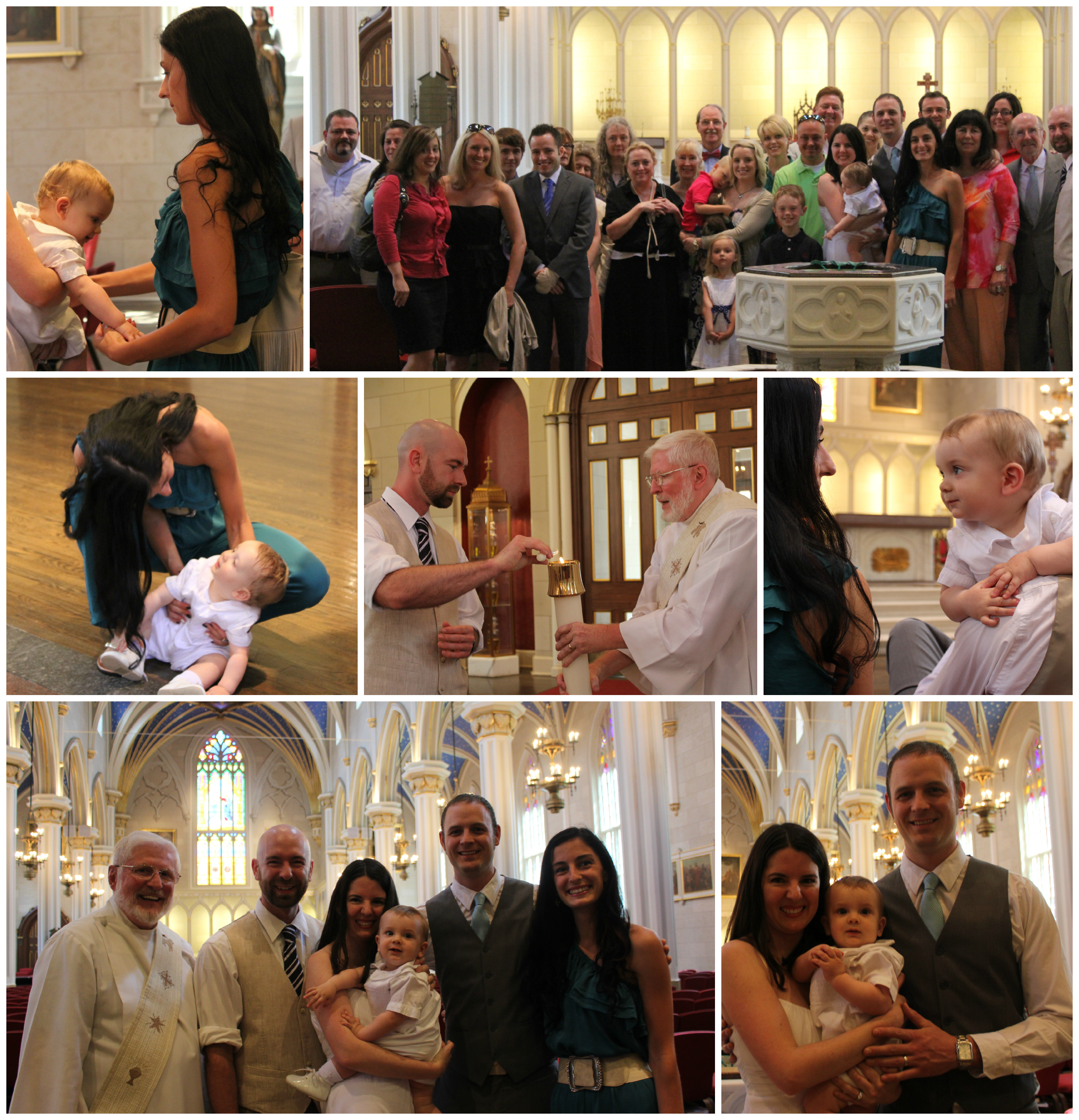 You were also baptized this month at the Cathedral of the Assumption, the same church where Daddy and I were married 5 years ago. We sought out Deacon Pat, who was also the man who married us all those years ago. He was so kind to come back and baptize you for us. It is cool to think that five years ago we walked down that aisle as husband and wife, and then walked it again now with our first baby boy. Your Aunt Katie is your God-Mother, and your Uncle Michael is your God-Father. All of our friends and family who live nearby came, and we had a reception afterwards at our family’s restaurant, Highland Morning. You’re a lucky little boy that so many people love you!