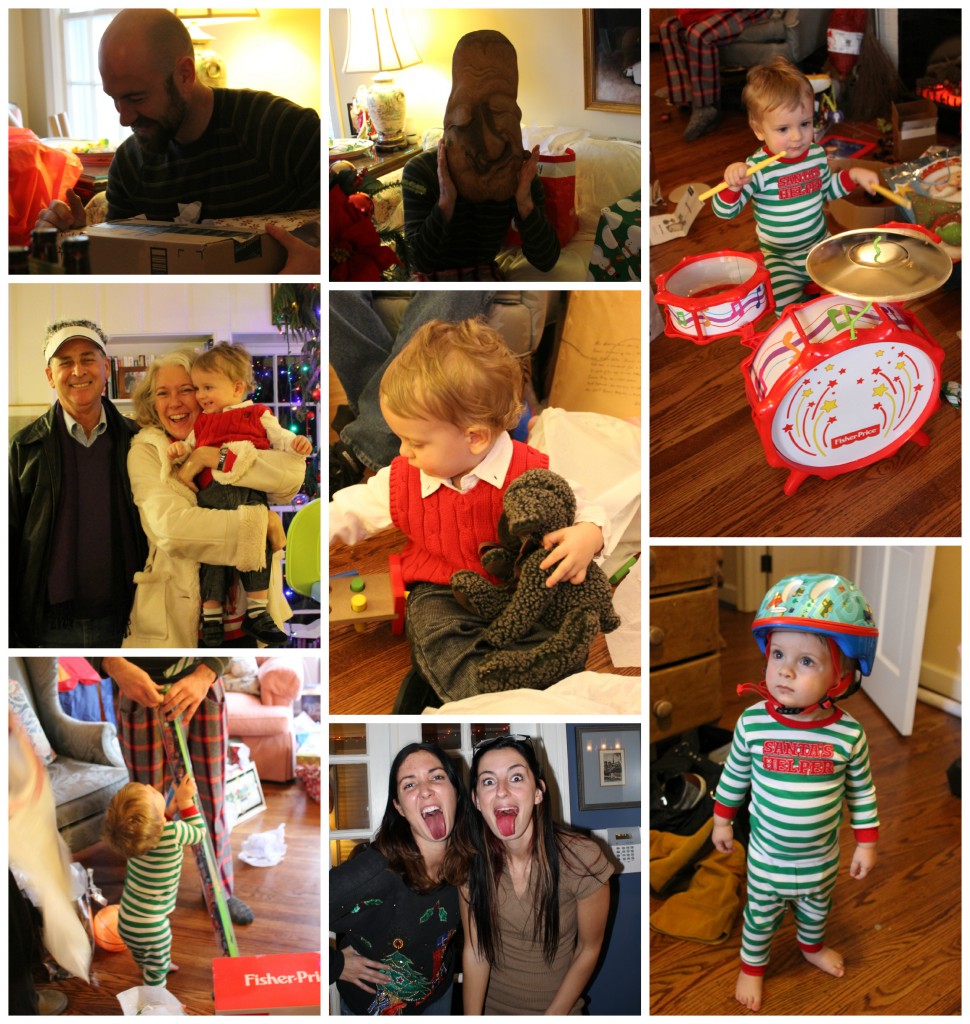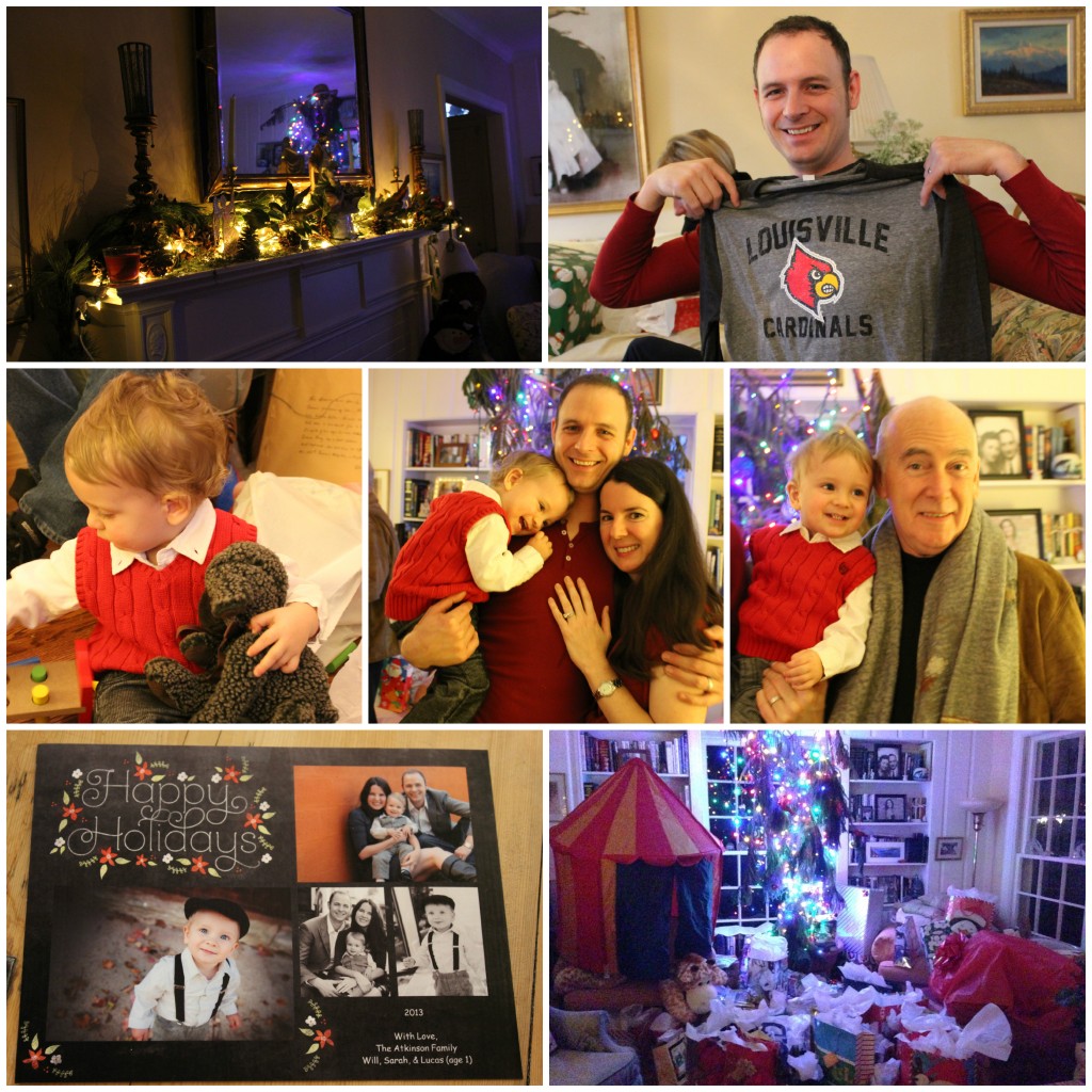 Speaking of playing ball, it is your favorite thing.  You try to dribble with both hands and love love love to shoot.  Daddy has raised the goal up so high that you really have to shoot the ball instead of just slam dunking it in.   On Christmas Day Aunt Katie got you another basketball goal to keep at Grammy and Poppy’s house since you love it so much.   For actual Christmas Day, we drove into Louisville and spent the day with Uncle Michael, and Aunt Katie, and other family members.  You had your annual new Christmas jammies on, and Uncle Michel wore my Pop’s (Poppy’s Dad) traditional Christmas pants.  We also played the traditional Christmas music.  It was so much fun to see all the stuff Santa brought you, in addition to all the stuff you got from us (Mama and Dada), and from your Aunt and Uncle.  Grammy and Poppy even left some bonus gifts for you under the tree even though they couldn’t be there.  Uncle Joey was also out of town, but we sure made up for it with the stuff you got to open.   You really enjoyed opening and playing with all of your toys.  You got cars, and talking pigs, and hats, and a circus tent, and a stuffed animal twice as big as you, a mini-4 wheeler, and hammering set, books, clothes, tunnels, but as soon as you opened your basketball goal that was all you wanted to play with for the next couple of hours!  I had to open the last couple of presents for you since you were so preoccupied with basketball.   We all had so much fun watching your Christmas morning joy.   Later on in the day, we made a huge feast and Aunt Christe, Uncle Potter, Uncle Randy, and Cousin Kelly, and Max came over to celebrate.    Of course later on that night we played a vicious game of Catch Phrase with more friends who always come on Christmas night (Hi Mike Slat and Nina!).