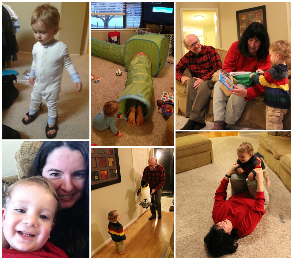 It’s time again for your monthly recap (well actually I’m a month late due to technical difficulties).  Regardless, it was a fun month!  First of all, your Poppy was able to come home from Australia to visit for a week in early December!  He brought you tons and tons of presents!    You love to say his name Pop-pop! Pop-pop!   When he’s back in Australia (where Grammy is too now), we call them on Skype and you always ask for Pop-pop.  You can’t say Grammy yet, but I’m sure it’s coming soon.    Also in December was the first night I ever spent the night away from you.   Your cousin Kelly got married in Louisville and you were sick so you stayed home with Elyse, and Daddy and I went in to Louisville and stayed at The Galt House for the wedding.  It was a fun night, but we sure missed you!