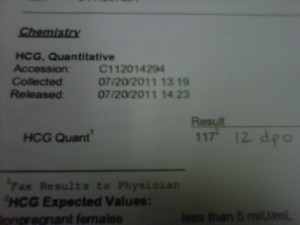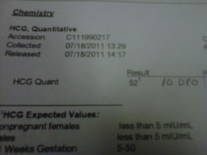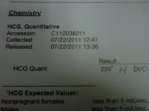 I’m fortunate to work in a fertility clinic where I can speak with a specialist whenever I want to, so on Monday I told my boss that I was pregnant and freaking out about the medications, radiation, and surgery that I had. He told me I had absolutely nothing to worry about because I had only been 2 days pregnant at the time, and the embryo hadn’t implanted into my uterus yet. WHEW! That was a major relief. If we had gotten pregnant last month (the first month we started “trying”) then it could have been disastrous. Just to be sure, we had my blood drawn Monday and got an hCG level of 52 at 10 days past ovulation, which is a very strong number. However, the real test is to see if the hCG numbers double approximately every 2 days. So, on Wednesday I had it drawn, and got a level of 117 (so relieved!), and again on Friday for a level of 220. So far, so good!