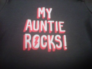 all waiting on Katie to get to the house, and of course she was hours late. I bought her a onesie that says “My Auntie Rocks” and when she finally arrived I had it in a bag with some