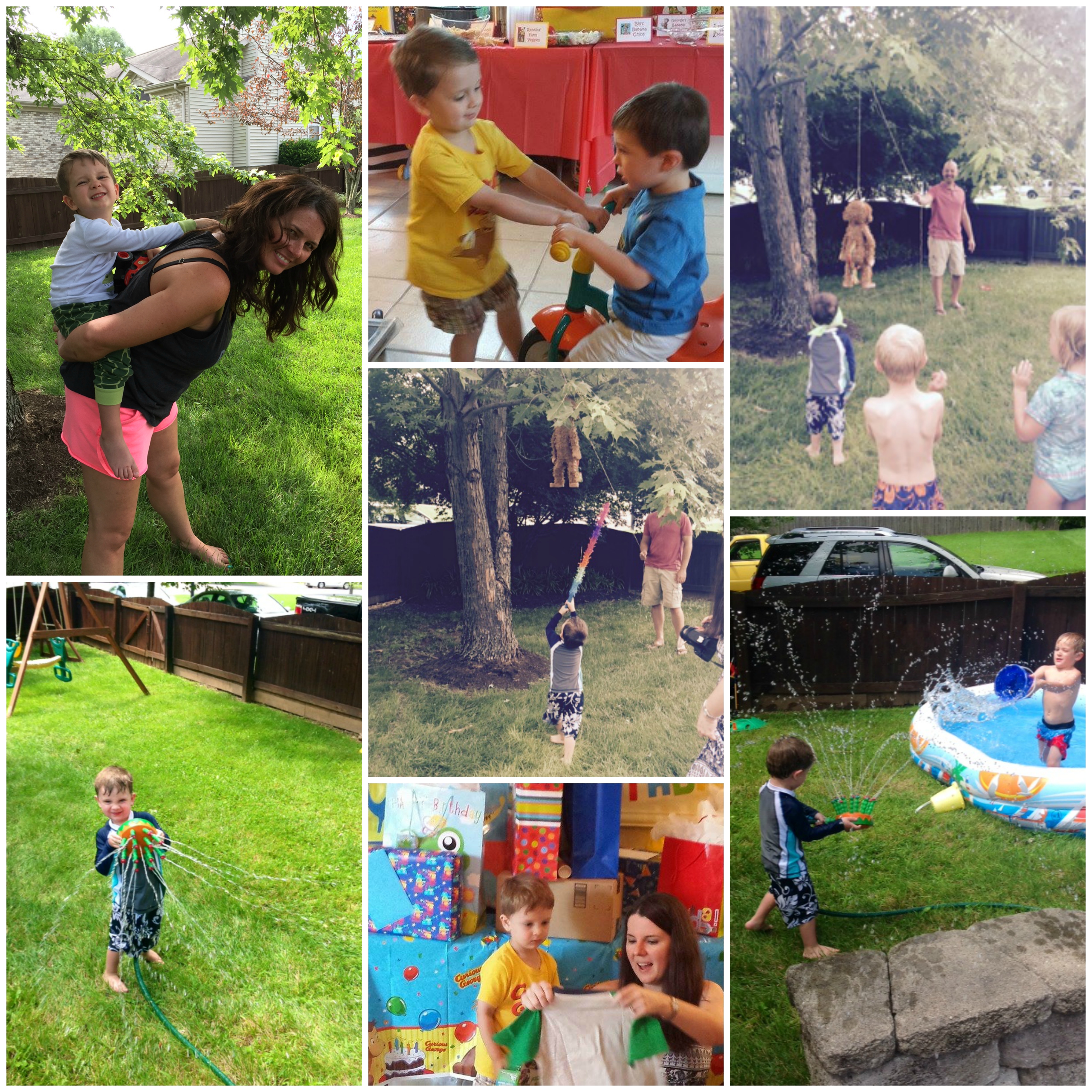 . You wore your Curious George shirt of course, and we had everything decorated in yellow and red. Daddy drew the most amazing Curious George Doorman that greeted people as they walked in the house, and a handmade Chef Pisghetti’s Ristorante sign to go above the food table. We blew up pictures from Halloween when you were George, I was Professor Wiseman, and Daddy was The Man in the Yellow Hat. We had bananas everywhere as decoration, and we served food based on the character’s in the show. We had Betsy’s Banana Split Bar, Chef Pisghetti’s Pizza, Monkey Juice (lemonade), Monkey Punch (koolaid), Bill’s Banana Chips, The Man in the Yellow Hat’s Monkey Munch, Hundley’s Party Weenies, Gnocchi’s Nachos, George’s Banana Pudding, Professor Wiseman’s Popcorn, and of course, an awesome Curious George cake. We busted our butts on your party, but it turned out fabulous! You had so many friends and family from near and far come. Your favorite presents were a Fart Gun (we call a toot gun), monster machines (Blaze and Lucas Crusader), and Teenage Mutant Ninja Turtle stuff.