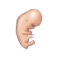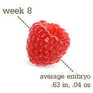 Yesterday we were 8 weeks prego! Our baby is the size of a raspberry or gummy bear (or kidney bean as some websites say, but raspberries and gummy bears seem so much cuter). He/she doesn’t have much of a tail anymore (way to not be a tadpole child of mine!) The baby is constantly moving even though I can’t feel it yet. Webbed fingers and toes are beginning to grow on its little stubby hands and feet. It has lots of joints that can bend back and forth now. Our baby is around .63 of a inch long, and is growing about 1mm a day this week. Also this week he or she is developing taste buds…. the better to taste all of daddy’s food with!
