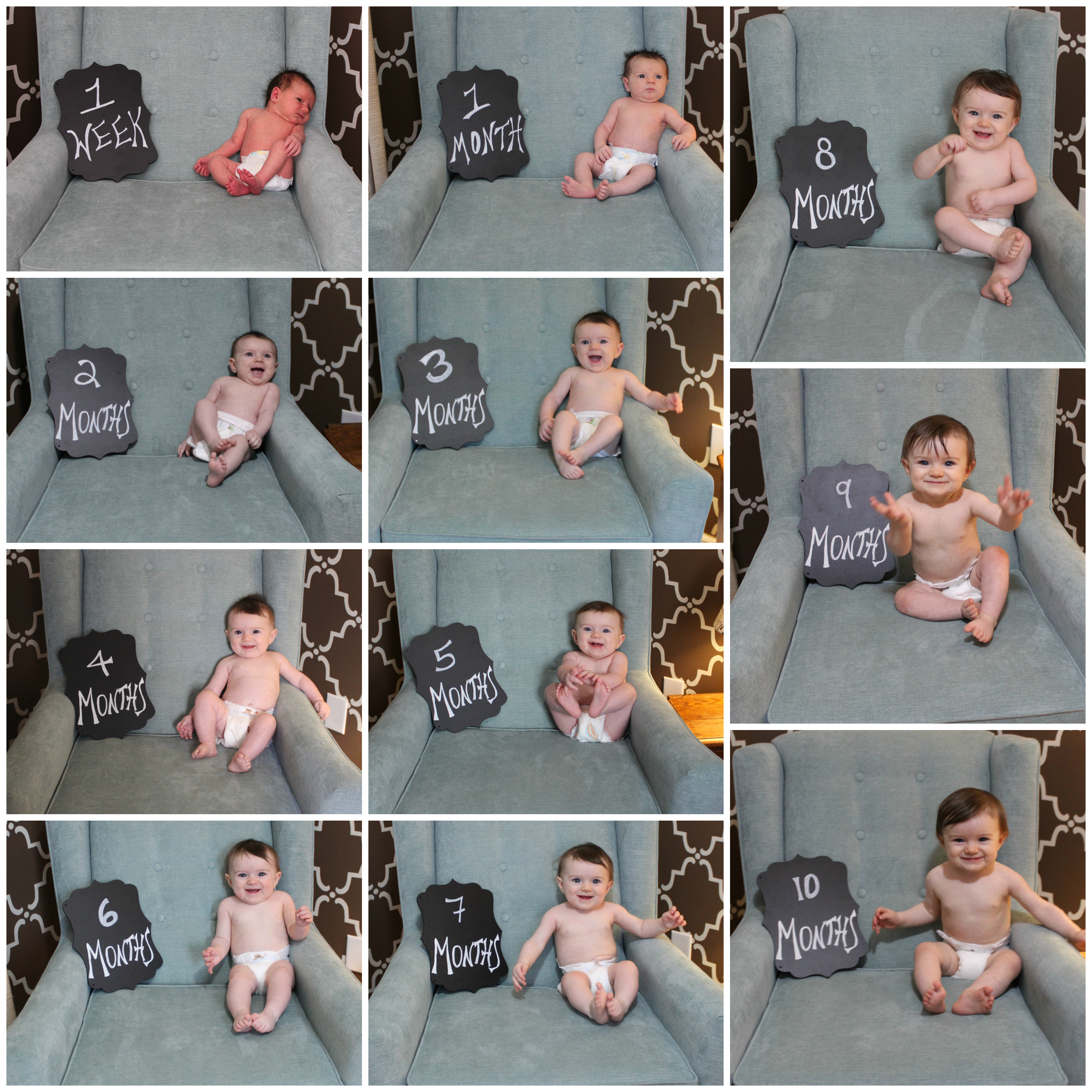 This month you really started dancing. All the time! You love dancing. To commercials, to toy music, to cell phone ringers, to anything! It’s so precious. You are coasting around on all the furniture, and even CLIMBING. God help us! You’re such a little dare devil. You have also mastered the high five! You get very happy with yourself whenever you master a new skill. Such a funny baby. You were 16 lbs, 1 oz this month, and 28.75 inches tall. That makes you in the 80th percentile for height, and 5th for weight. The pediatrician said you are healthy -tall and skinny just like your parents.