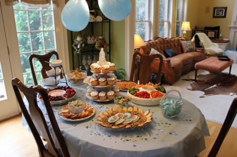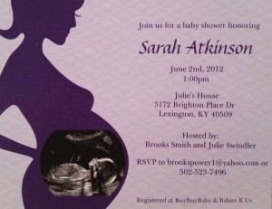 This past weekend was our Lexington baby shower thrown by your Auntie Brooks and Auntie Julie, and of course it turned out fabulous!   Look at the cute invitation, that’s really a picture of you on it!    We (all three of us!) are so lucky to have so many awesome friends and family who support us and love us.    Your sweet little cheeks are going to be squeezed so much by all the people who love you when you get here, I hope you don’t end up looking like a chipmunk baby!!  :)