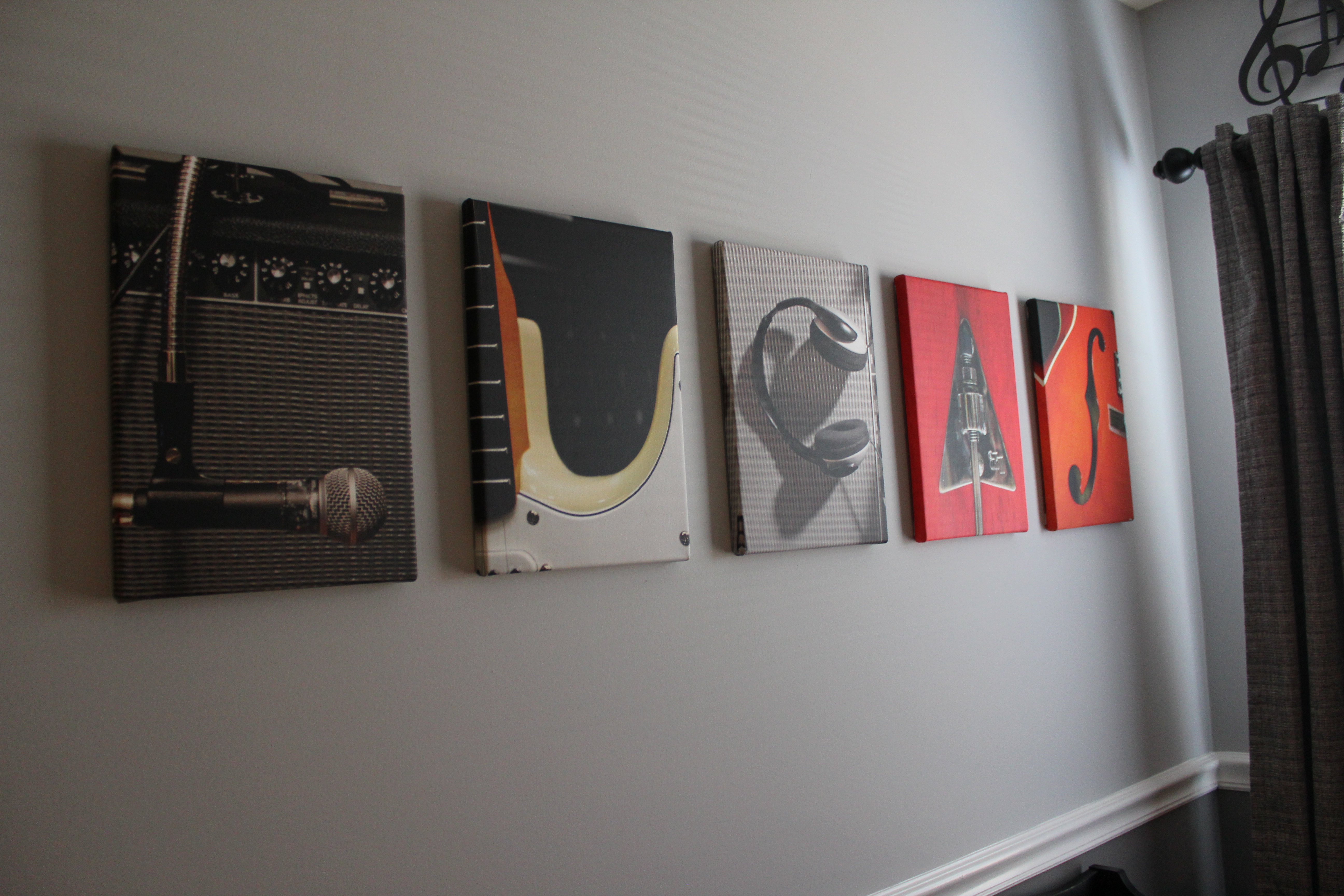 My personal favorite are the letters above your changing table, they spell out “LUCAS”.   I took the photos myself of different types of musical equipment, and then we had them blown up on canvas.  Aren’t we crafty?!?