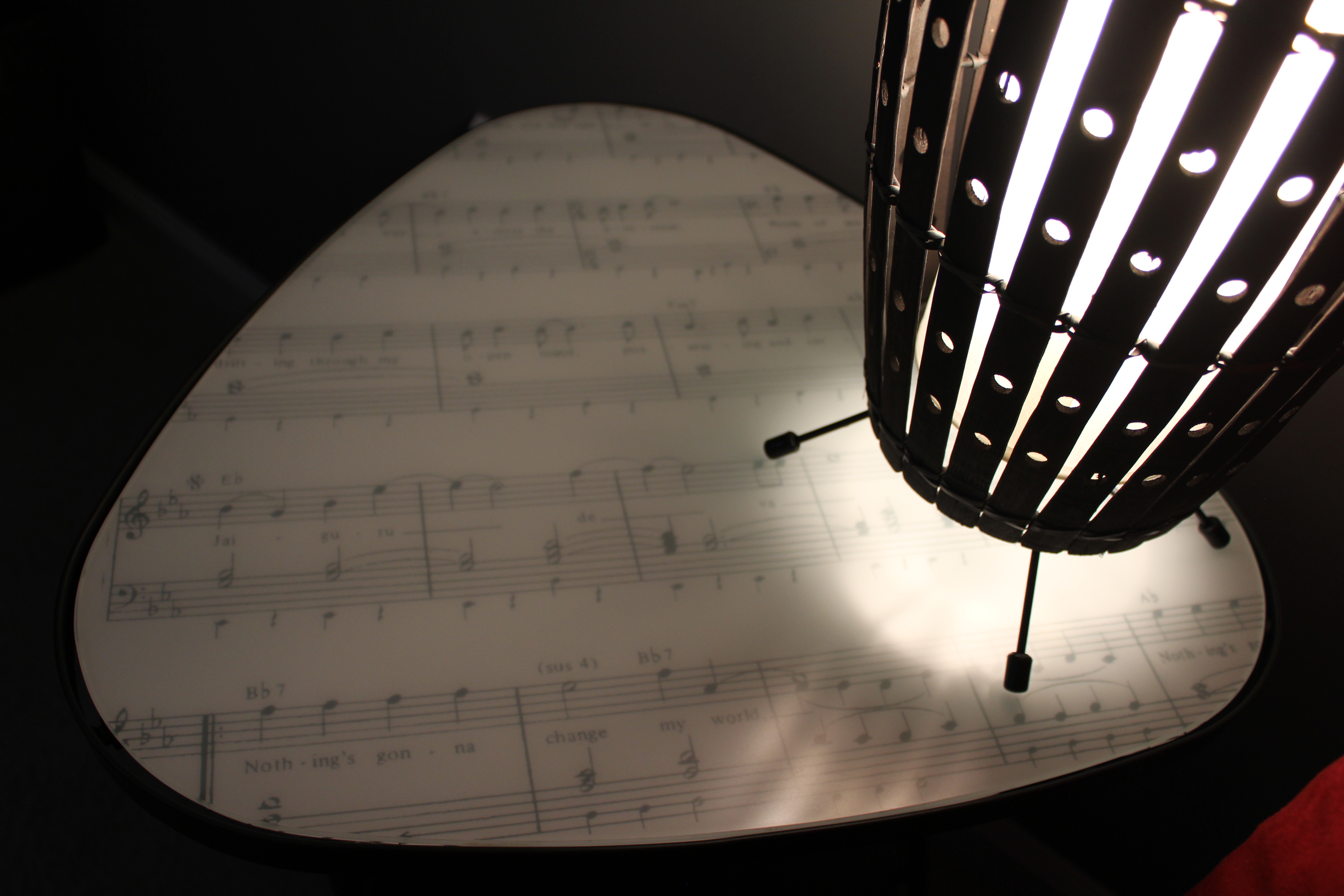 The table is in the shape of a guitar pick, and we customized it by having sheet music (your Dad picked the song “Across the Universe” by the Beatles) blown up onto poster board, and then Dad cut it down to size to fit the table.   The light on top of the table is in the shape of a bongo drum.