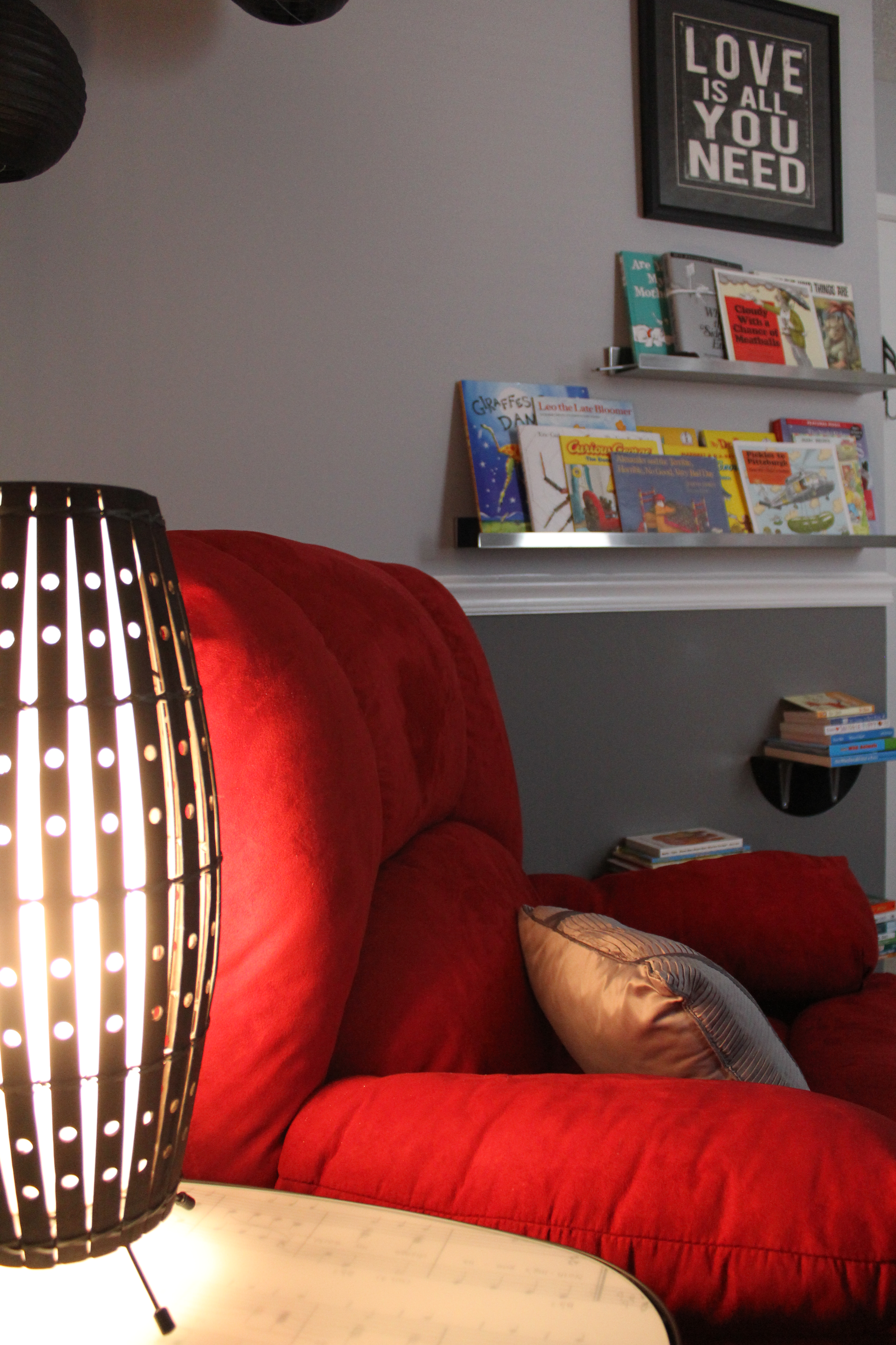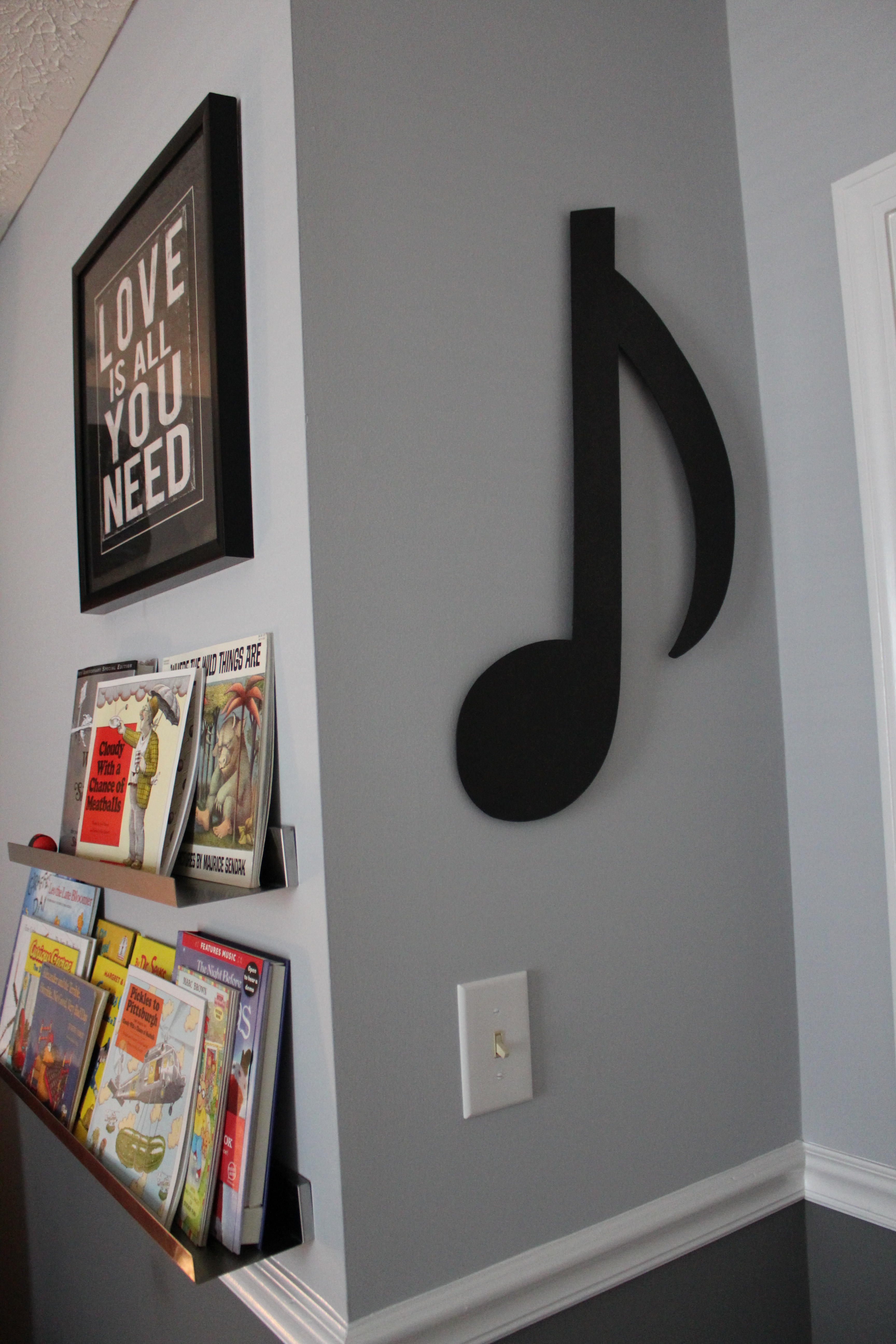 In your reading nook, your Dad heated up some old records, and bent them to make your bottom shelves.   We then stacked books on them so you’d be able to reach them one day!   And we can’t forget the “All You Need Is Love”  (The Beatles) print :)     Even your hangers on the back of the door are musical shaped.